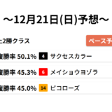 | 複勝率 | 馬番 | 馬名 | 能力 | 性齢 | 斤量 | 騎手 | 脚質 |